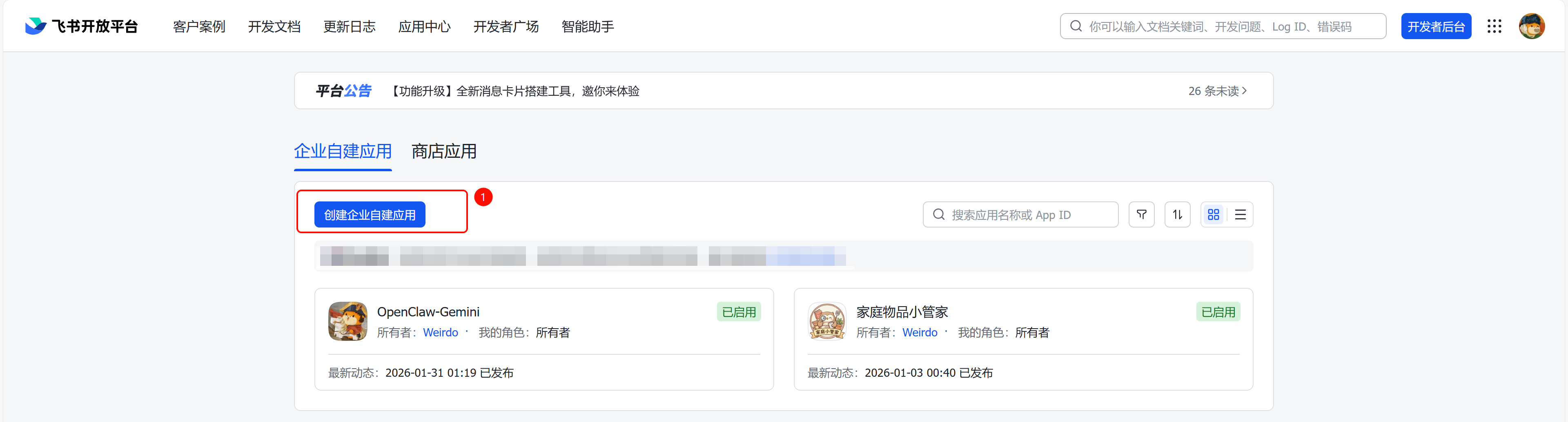 访问 飞书开放平台,使用飞书账号登录。 - 创建应用