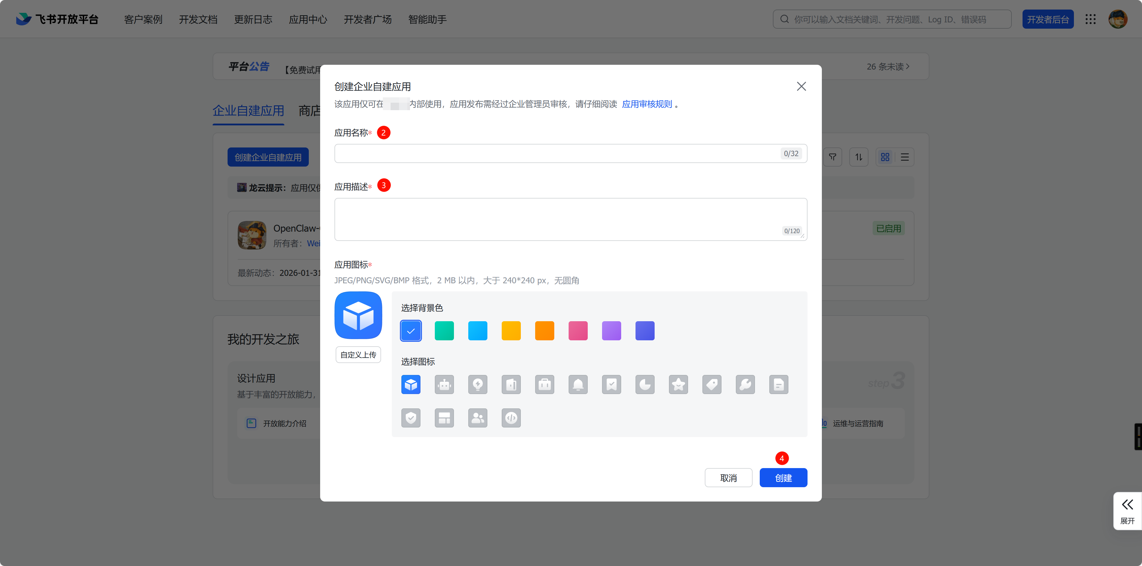 填写应用名称和描述、选择应用图标、创建企业自建应用