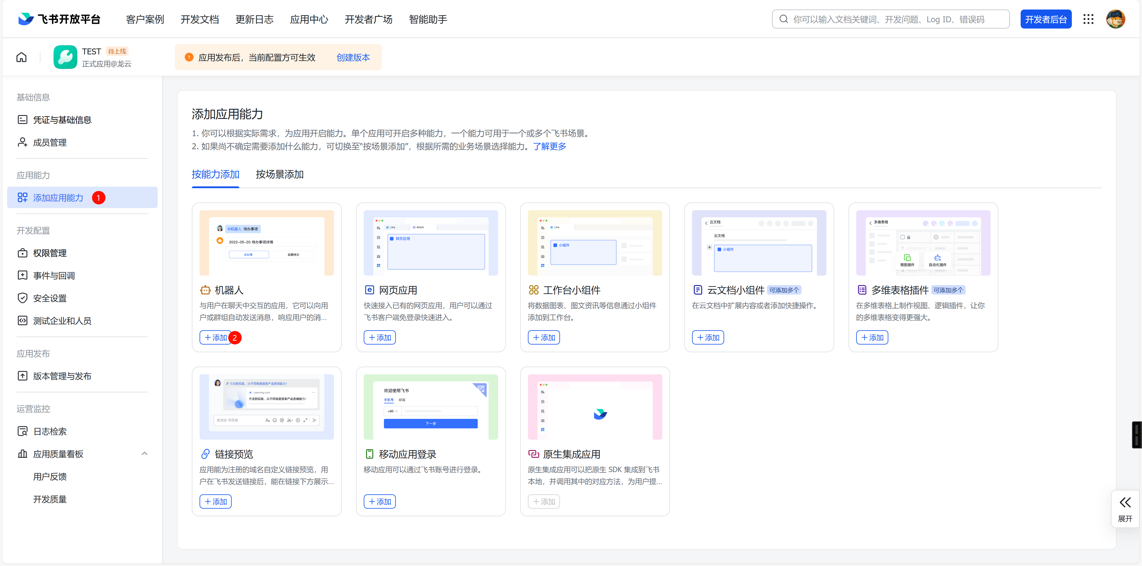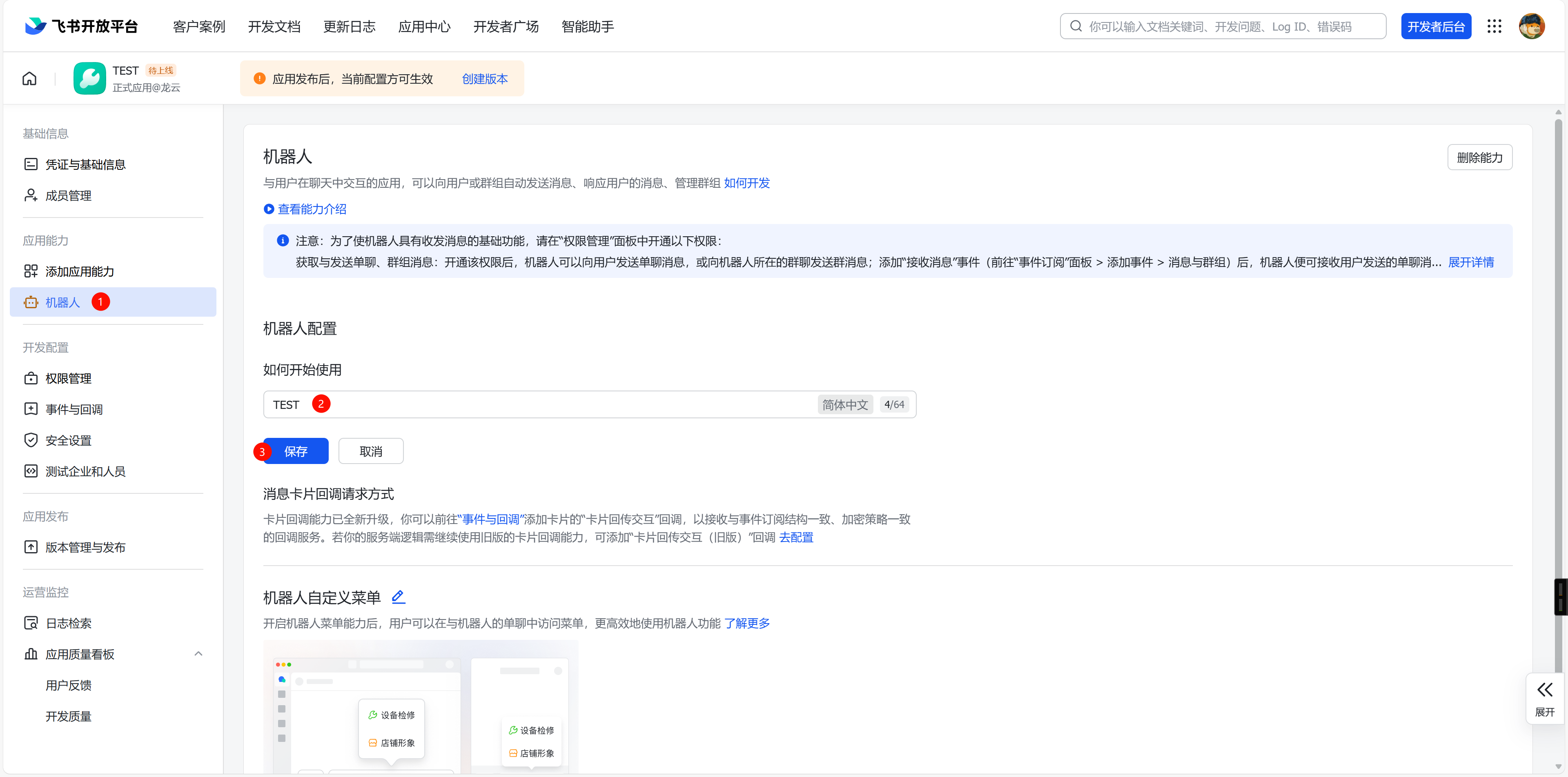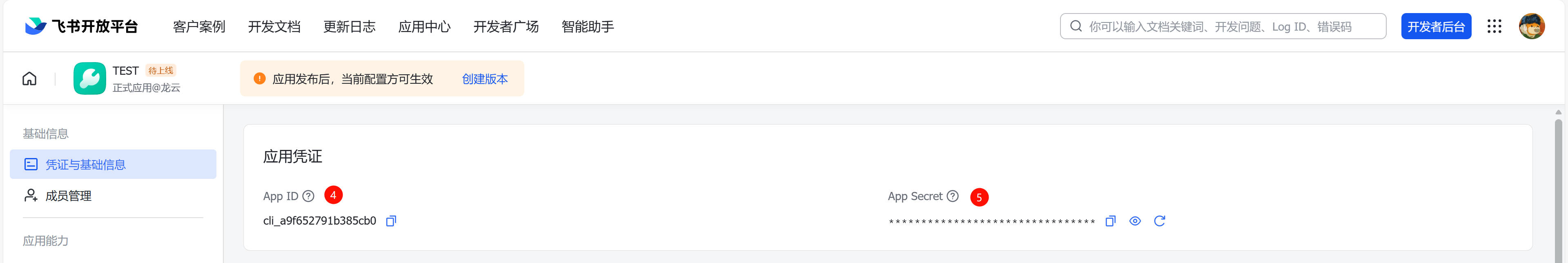 - 发布应用:在 版本管理与发布 页面创建版本,提交审核并发布,等待管理员审批(企业自建应用通常自动通过)