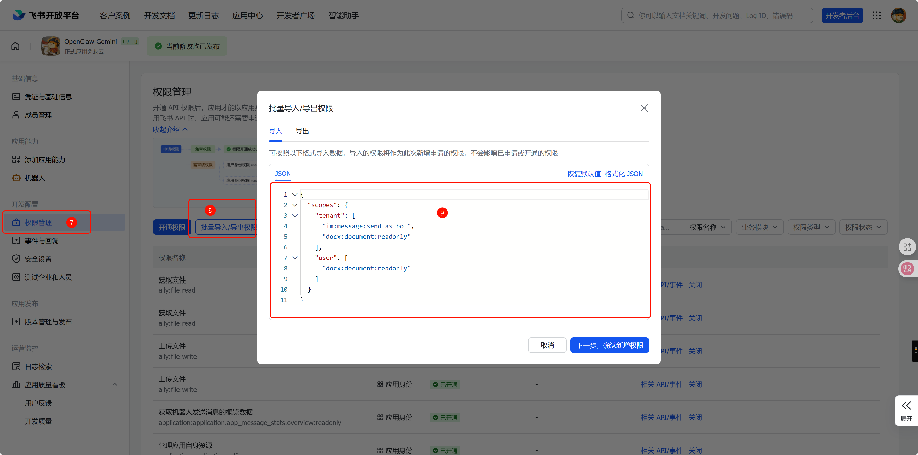 在 权限管理 页面,点击 批量导入 按钮,粘贴以下 JSON 配置一键导入所需权限: