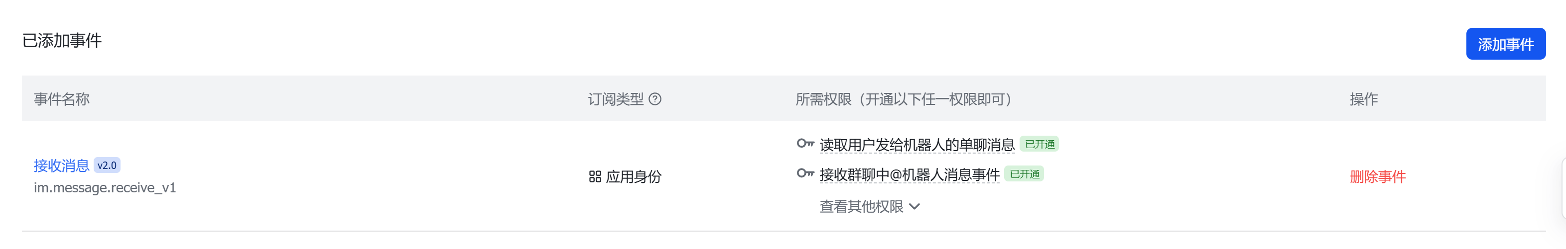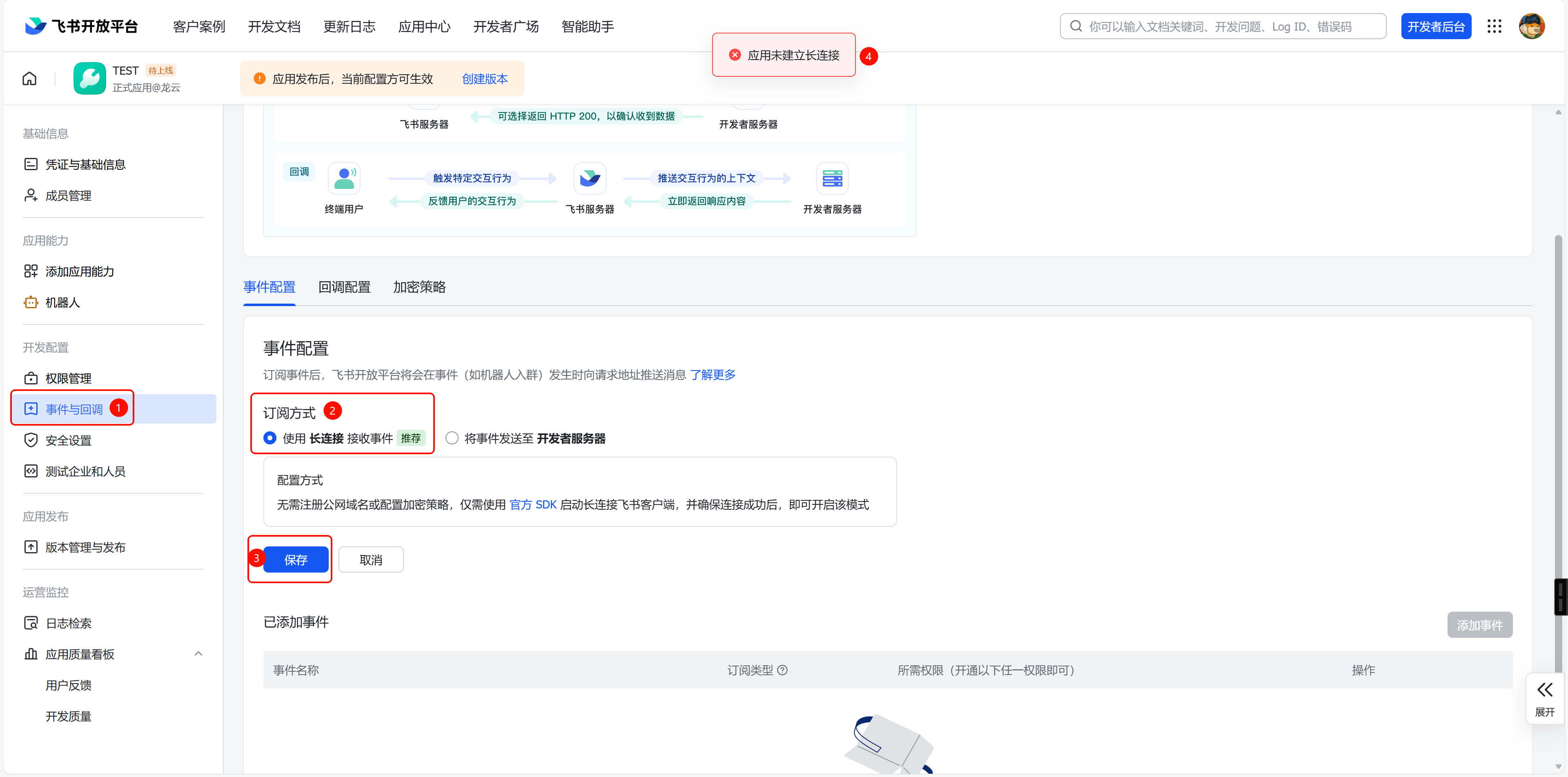 - 在 事件订阅 页面:选择 使用长连接接收事件(WebSocket 模式);同时添加事件:im.message.receive_v1(接收消息)