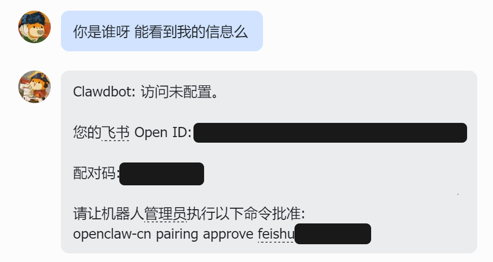 默认情况下,机器人会回复一个 配对码。您需要批准此代码,批准后即可正常对话。